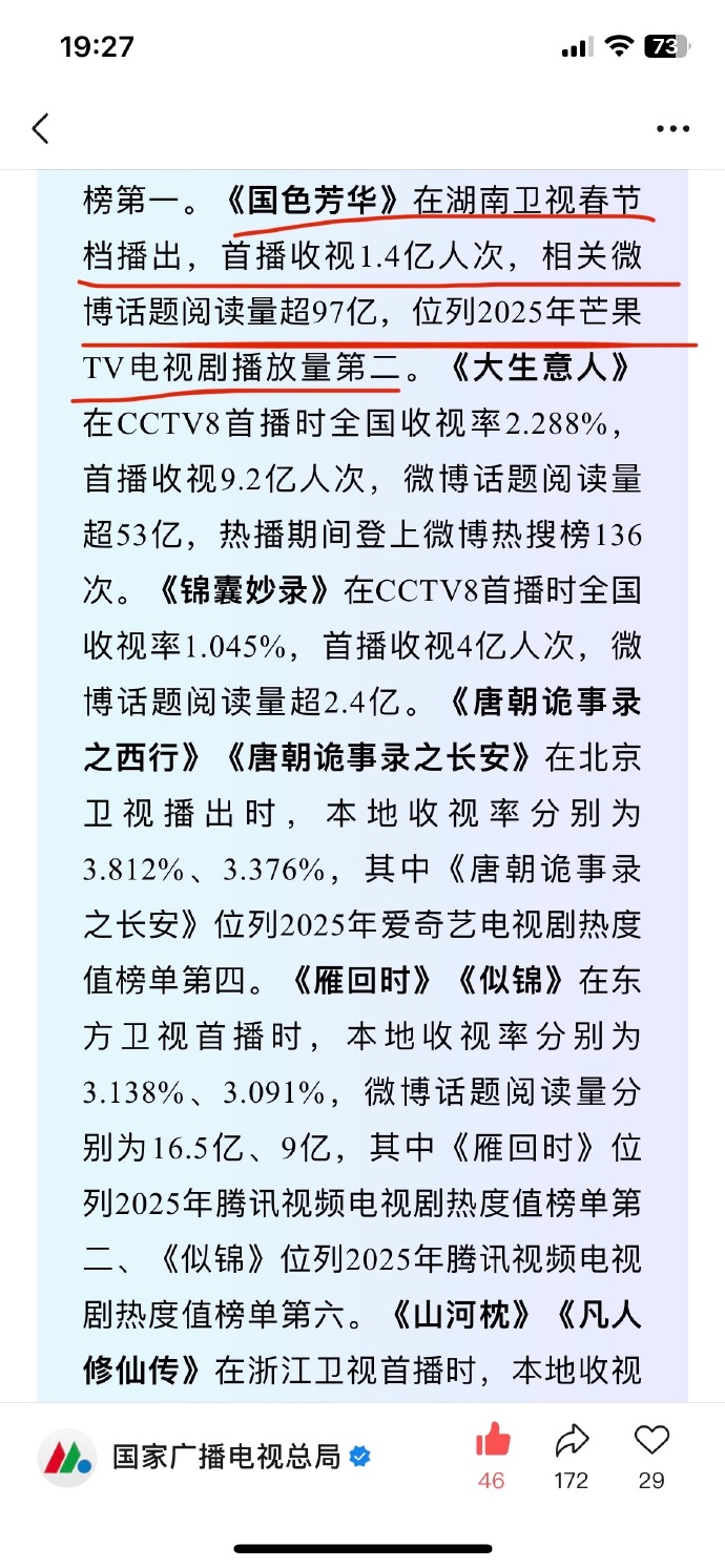 本帖最后由 南雪 于 2025-11-28 13:18 编辑 剧楼主要讨论剧情,数据刷屏也不合适。剧完结了,除了重刷就是追追数据,聊聊天,比如前台播放量,猫眼年榜、日榜增长量,红薯讨论量什么的。 如果看的人多,我再去申请置顶,大家边看边聊天。没啥人的话,我就当个数据存档楼。因为会贴实时数据,会出现其他剧对比,不喜欢出楼,在这里指责我,我就删层。 |