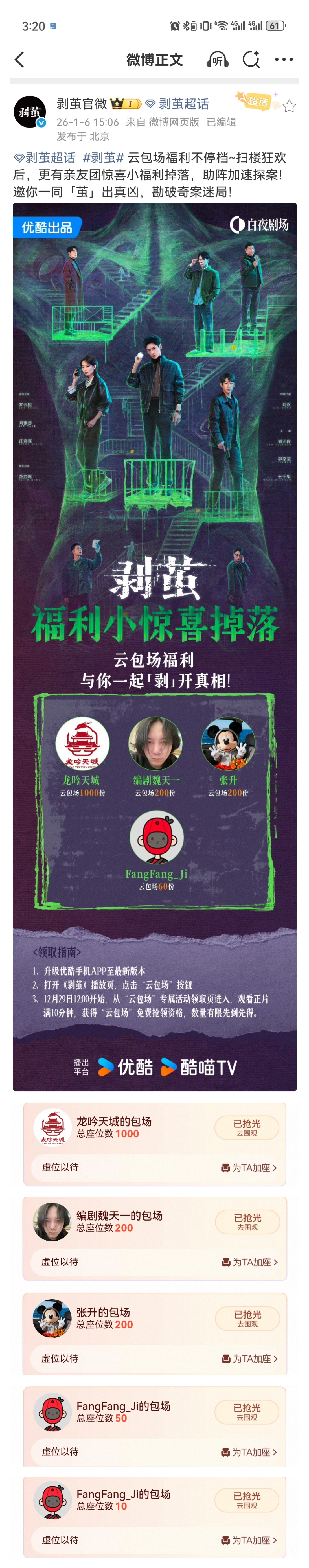 我搜了一下官微,之前感谢的云包场没有这四人。但是今天才感谢这也太晚了吧。我还以为是新的…