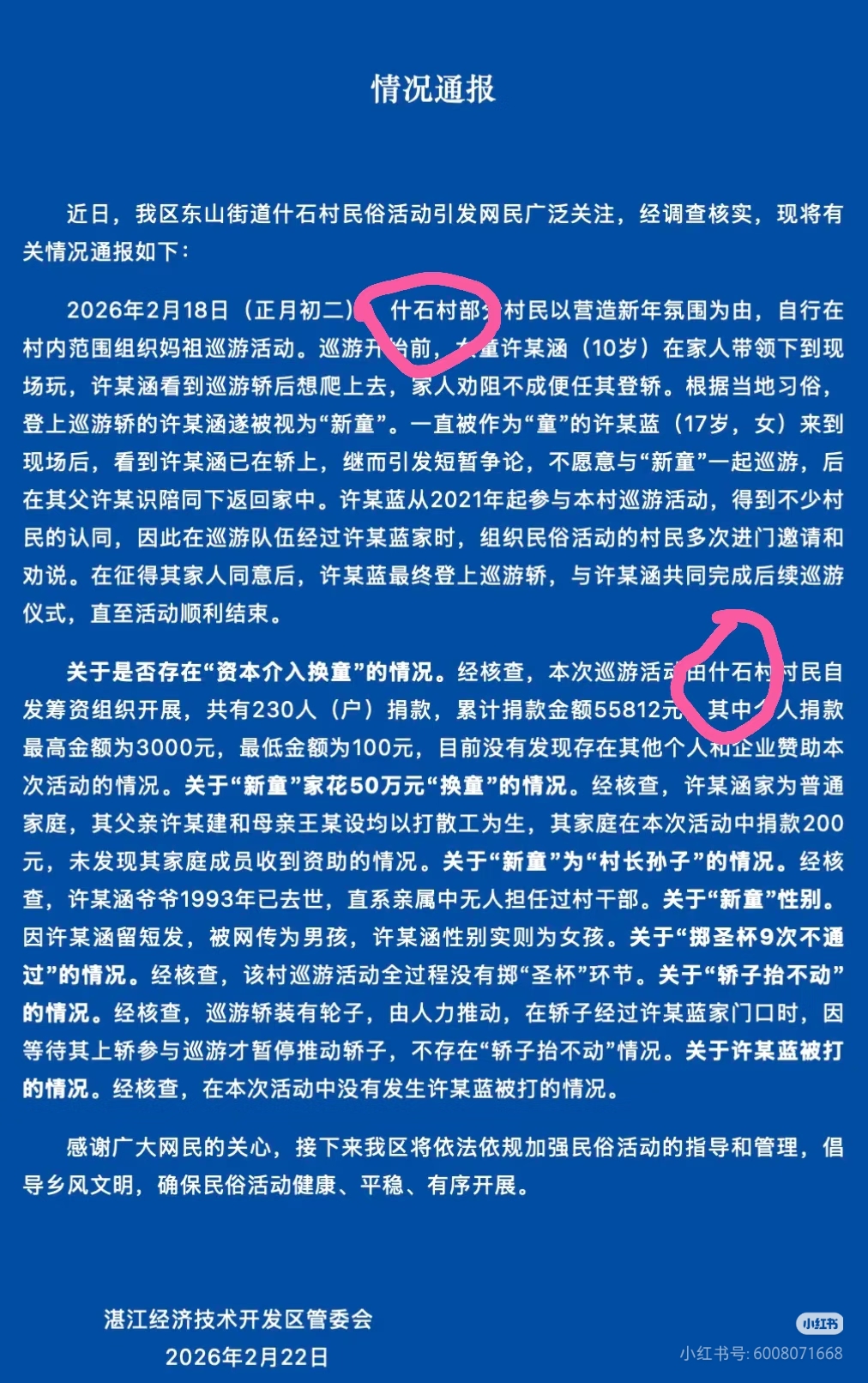 本帖最后由 兔兔不吃胡萝卜 于 2026-2-23 00:12 编辑 我选了娱乐八卦分类,对不起妈祖,我忍不住八卦的心。 这种事情,信则有不信则无。 我对神明之类的一直抱着敬仰之心,但是这事居然反转了。 湛江经济技术管委会 发蓝底白字通告了。 省流版: 首先,小的那个不是男孩子是女孩子。 其次,是小女孩自己调皮爬上去的,但是爬上去了也就是新童,所以村里人就认可这个小女孩做童了。 第三,因为村里有些人还是想让大女孩子做童,所以轿子停在那里等大女孩过来,不是轿子抬不动,中间也没有圣杯环节。 最后,这个小女孩爷爷不是村长,家境一般。 这个通告其他的不说,最后这点澄清我觉得很有公关技巧,我记得没人讨论过这个小女孩爷爷是不是村长吧,只说这个小女孩家里很有权势。另外,只要爬上去就可以做童这一点也很存疑呀,如果是这样,那岂不是会打破头?事已至此,这事肯定是很大了,以后这个村子的人在福建那边做生意可能也会受影响的。 |