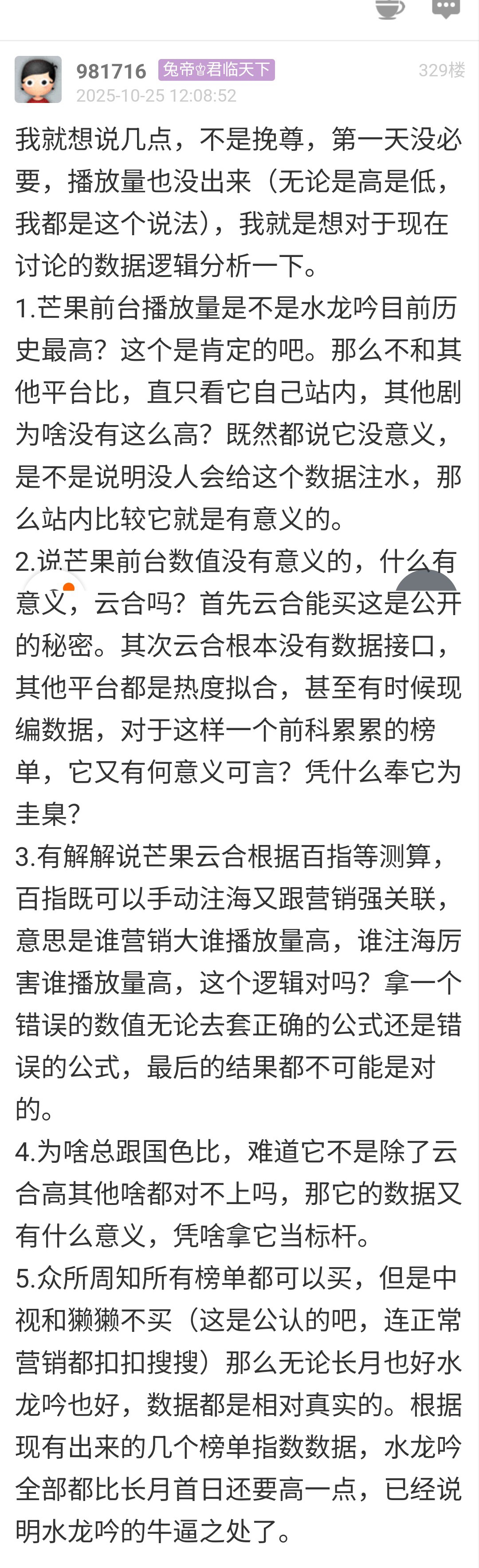 说白了,这个东西就是一种游戏。因为各种各样的原因做假数据。有的是为了撕资源啊,有的人是为了呃钱啊,上市啊,有的是为了嗯,走账啊什么的,反正各种各样的原因导致内娱的数据都是失真的。也可能有一些大众不太关注的漏网之鱼啊,比如像芒果的徽章馆这种东西能暴露一些问题。但大部分时间内娱尤其是粉圈老爱拉表格的那些榜啊,其实什么用都没有,都是按照资本的需要。 内娱有些人呢就需要这种虚假繁荣的数据。那其他人呢就不需要,或者是部分需要或者偶尔需要。 啊,有些人他就是常年维护这些东西,那他就是需要这个东西。那有些人就压根根本就一点不买,那可能就是用不上。 而且本来就是内娱就被那些老登把持的。他们之间就是互相跳槽啊,窜来窜去的,玩来玩去的就是那么几个人。他们之间很容易利益勾兑。 我觉得这都是一个常识吧。好多年,好多年以前我就说了内娱拉这些破表格啥用也没有。其实就是皇帝的新装需要用他的人就说很漂亮,实际上大家都知道那都是假的。实际上也不看这个。 |