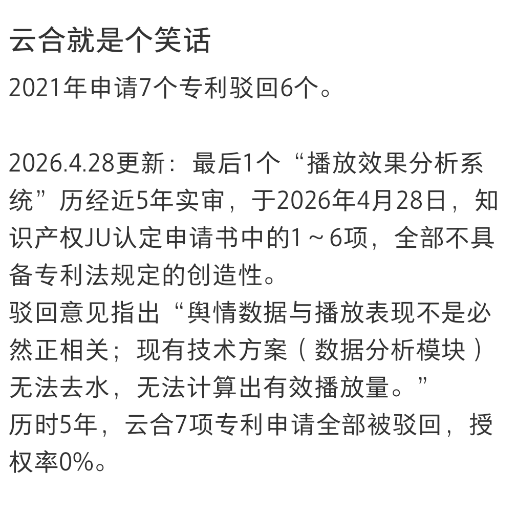我在小红书刷到这个,为什么昨天说云合,可能是28号最后一项专利被驳回了吧(我猜的,当然可能趁机废云合也有别的目的) |